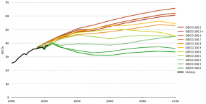 Estas proyecciones a fin de siglo, combinadas con un modelo geofísico estándar indican una cierta mejora en la temperatura global a largo plazo: GECO 2015 proyectaba un incremento de temperatura media a finales de siglo de 3,2 °C, pero GECO 2024 estima que este incremento podrá limitarse a 2,6 °C (probabilidad media).