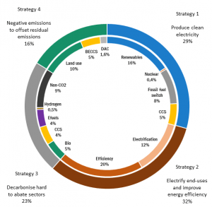 GECO 2024 identifica y evalúa estrategias conducentes a una descarbonización que limite el calentamiento global a 1,5 °C. Esto incluye el examen de escenarios de transición energética, y de cambios en el uso del suelo, y explora diversas tecnologías que pueden ayudar a reducir las emisiones de gases de efecto invernadero. Destacan las energías renovables (solar, eólica, hidroeléctrica), las mejoras en la eficiencia energética, captura y almacenamiento de carbono (CAC) y combustibles alternativos como el hidrógeno. De manera general, cuatro estrategias ofrecen una hoja de ruta integral para lograr la neutralidad climática global: (i) descarbonizar el sector eléctrico, (ii) expandir la electrificación del consumo final, mejorando al mismo tiempo la eficiencia energética, (iii) reducir las emisiones de los sectores difíciles de mitigar, y (iv) maximizar el potencial de los sumideros de carbono. Las tres primeras estrategias son esenciales para la transición energética general, mientras que la cuarta aborda la gestión de las emisiones residuales de gases de efecto invernadero.