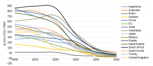 Fig 4 Intensidad carbónica de la generación eléctrica (arriba) y cuota de electricidad no-fósil (abajo) en los países del G20 entre 2020 y 2060, escenario 1.5°C.