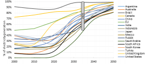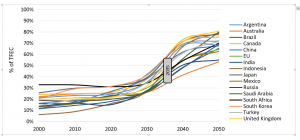 Fig 5 Fracción eléctrica en la cesta de demanda final de energía para los países del G20 entre 2020 y 2050, escenario 1.5°C.