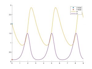 Tal vez, la característica más importante de las soluciones del sistema es que todas son periódicas en tiempo (véase la Fig. 3). Esto se puede demostrar rigurosamente y se explica con facilidad: los depredadores no pueden sobrevivir sin presas; cuando éstas empiezan a escasear, los depredadores no tienen demasiado alimento y por tanto disminuye su ritmo de crecimiento; pero entonces las presas empiezan a recuperarse y vuelven a crecer hasta valores anteriores; y así sucesivamente …