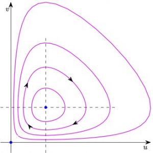 Aquí, \(\frac{du}{dt}\) y \(\frac{dv}{dt}\) denotan las derivadas despecto del tiempo de las funciones \(u\) y \(v\) (las velocidades con las que cambian los valores de \(u\) y \(v\). En la primera ecuación, vemos que, si fuera \(v = 0\), la población depredadora tendería a la extinción. Por el contrario, en la segunda vemos que la ausencia de depredadores permitiría a la población \(v\) crecer (y vivir en paz).
