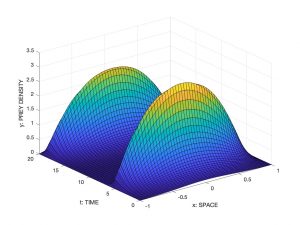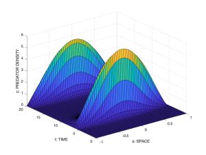 ♦ También se puede esperar un comportamiento distinto en distintas regiones geográficas, con efectos importantes. Si queremos tener en cuenta su influencia, necesitamos complicar el aparato matemático y modelar el problema con ecuaciones en derivadas parciales. Por ejemplo, un modelo presa-depredaror relativamente sencillo que determina poblaciones repartidas a lo largo de un río es el que sigue, donde \(\alpha\) y \(\beta\) son nuevas constantes positivas: