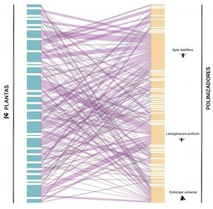 El conjunto de interacciones entre plantas y polinizadores se puede representar como una red bipartita. Bipartita significa que las conexiones se realizan entre dos grupos, nunca dentro de un mismo grupo, en nuestro caso nos referimos entre plantas y polinizadores. El número de interacciones por especie fue muy variable tanto en las plantas como en los polinizadores. Tal como se ilustra en la red de interacciones (Figura 1), tanto las especies de plantas como de polinizadores son bastante generalistas, es decir, que se relacionan con una amplia variedad de especies del otro grupo. De media, las plantas del parque fueron visitadas por 7 especies de polinizadores , 6 especies de plantas fueron visitadas por 10 o más, mientras que 8 fueron visitadas por 3 o menos. Algunas de las plantas que atrajeron a más polinizadores fueron el sauzgatillo (Vitex agnus-castus), el majuelo (Crataegus monogyna), la fotinia (Photinia serratifolia) y el árbol de Júpiter (Lagerstroemia spp.).