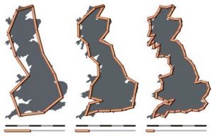 - Por comparación con la curva de Koch, es posible determinar de manera aproximada la dimensión fractal de una línea costera. Por ejemplo, se acepta que la costa de Gran Bretaña se puede representar por un fractal que tiene dimensión aproximadamente igual a 1.25.