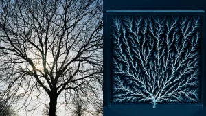 Fig. 9 – Las ramas de un árbol (izqda.) y la figura de Lichtenberg (drcha.), generada por las descargas eléctricas producidas sobre un material aislante. - Veamos cómo se puede calcular la dimensión fractal de la curva de Koch. Para ello, observamos que, en la etapa 1, cada segmento tiene longitud 1/3 y hacen falta 4. En la siguiente etapa, estamos utilizando 42 segmentos de longitud 1/32 y después 43 segmentos de longitud 1/33, etc. En general, cuando los segmentos tienen longitud L, necesitamos N(L) = 1/Ld segmentos, con d = log(4)/log(3), que es igual a 1.2618 …