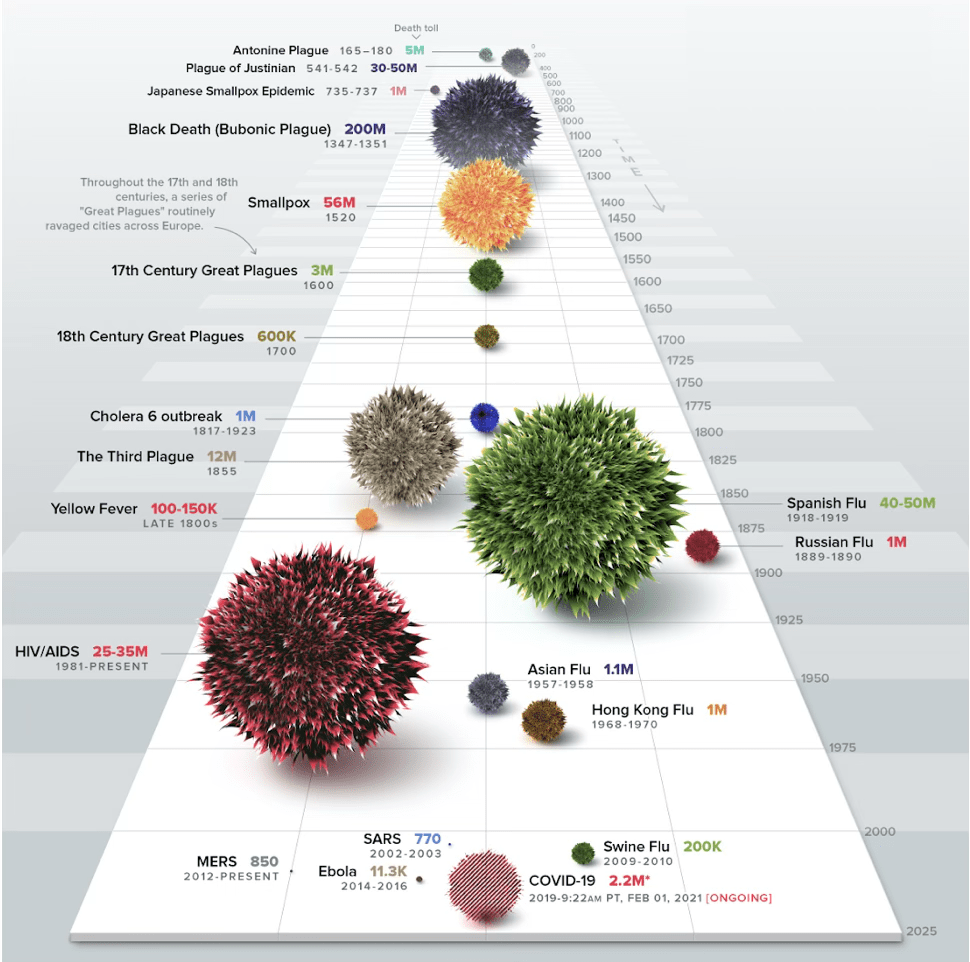 | Resumen histórico de las pandemias sufridas por la humanidad, indicando el número de fallecidos. La mayor parte de las más recientes (desde 1800) estuvieron invariablemente asociadas a alteraciones medio-ambientales. Fuente: https://www.buckinstitute.org |