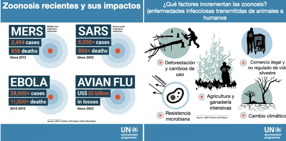 Impactos de las zoonosis más recientes y factores ambientales intervinientes. Fuente: UNEP Frontiers 2016 Report. |