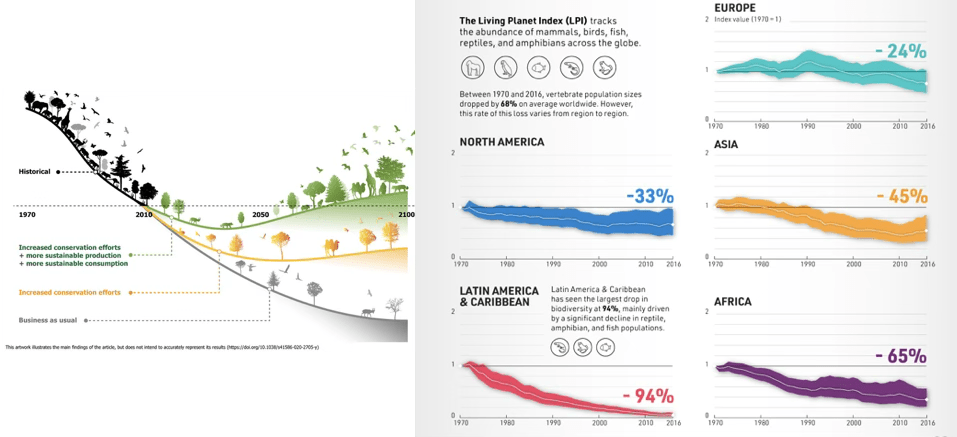Trayectorias previstas para el estado de la Biodiversidad planetaria (izqda.) de acuerdo con resoluciones activas de conservación, iniciativas de sostenibilidad, y cambios en pautas de consumo (en verde); sólo aplicando medidas de conservación (naranja); o continuando con las acciones actuales (en gris). Proyecciones (dcha.) del Living Planet Index; el LPI se evalúa de acuerdo con las tendencias poblacionales de abundancia de mamíferos, aves y otros vertebrados en nuestro planeta, para diferentes áreas geográficas. |