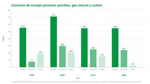 La evolución de la estructura del consumo de energía primaria en España refleja cambios apreciables, pero no una transformación de fondo. A mediados de los noventa, el sistema descansaba de forma muy mayoritaria sobre los combustibles fósiles: en 1995 el consumo de energía primaria ascendía a 102,7 Mtep, con claro predominio del petróleo, un peso muy relevante del carbón y un gas natural en fase de expansión. Diez años después, en 2005, el consumo total había subido hasta 145,1 Mtep y el patrón fósil no solo persistía, sino que se había reforzado: el petróleo alcanzaba 71,8 Mtep, el gas natural 29,1 y el carbón 21,2. Si se agrupan estas tres fuentes, los fósiles representaban entonces casi el 84% de la energía primaria consumida en España. El grado de autoabastecimiento de energía primaria era en esa fecha del 21% aproximadamente[1] con producción nacional prácticamente nula de petróleo y gas natural.