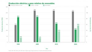 La evolución del sistema eléctrico español sí permite hablar, a diferencia de lo que ocurre con la energía primaria, de una transformación profunda. En 1995 la generación peninsular respondía todavía a un esquema esencialmente convencional: 146 TWh de producción bruta, de los que el 44% procedía de carbón, 38% de nuclear y 15% de la hidráulica. La aportación renovable era, por tanto, casi exclusivamente hidráulica y el sistema descansaba sobre un núcleo muy claramente térmico y nuclear.